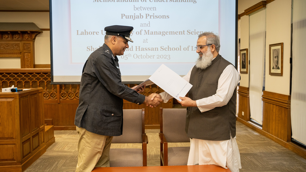 An MoU aimed at adequate delivery of criminal justice, raising legal awareness, and improving the well-being of prison inmates has been signed between LUMS and Punjab Prisons, Government of Punjab. Under this three-year agreement, students and faculty at the Shaikh Ahmad Hassan School (SAHSOL) at LUMS will collaborate with Punjab Prisons to deliver paralegal training for inmates for a deep understanding of their legal rights. The trainings will be designed by the School’s faculty and students under the upcoming Legal Aid Clinics at SAHSOL, while Punjab Prisons will be establishing a referral process for such cases. The Law students will support inmates on their bail petitions.