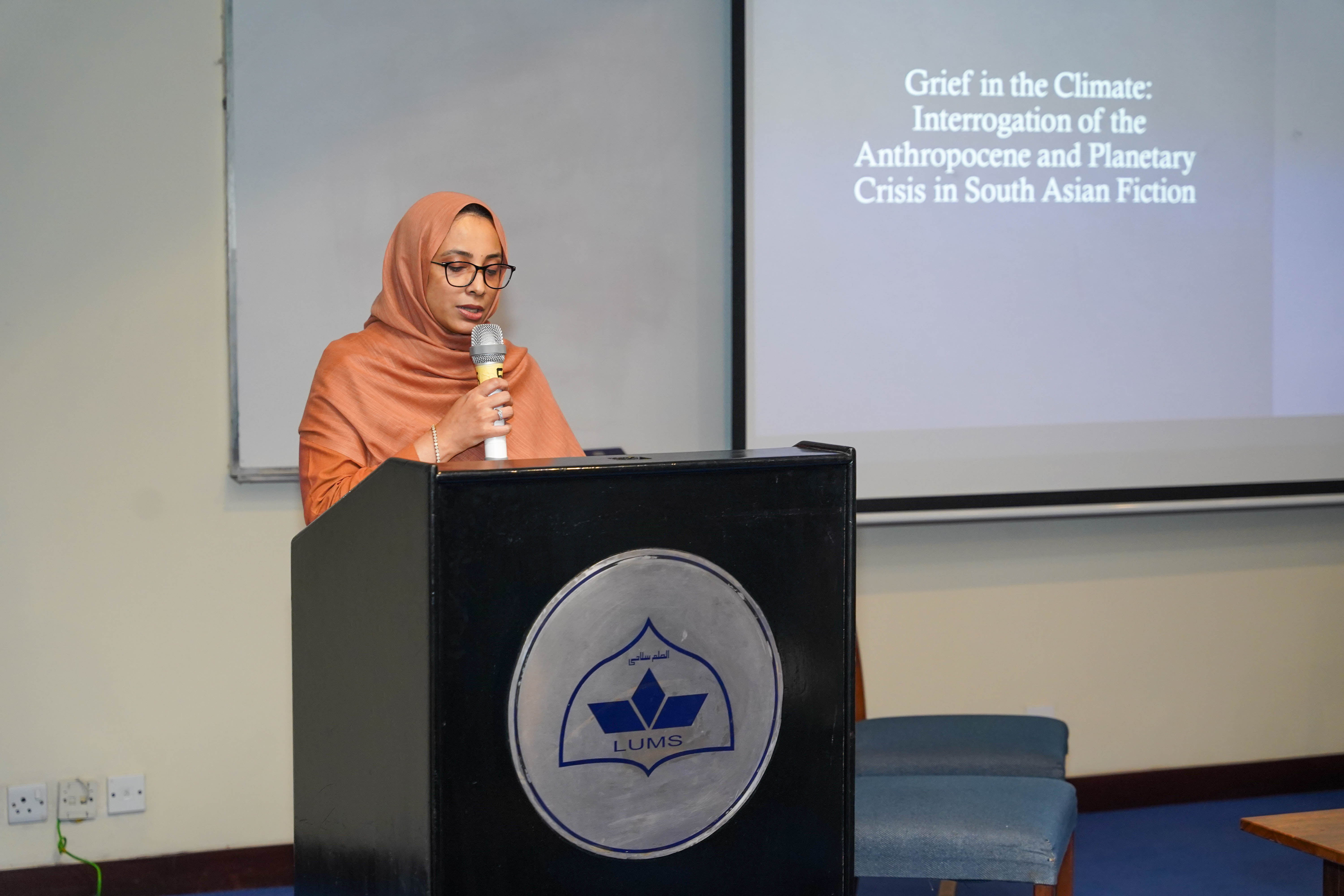 The first talk, titled ‘South Asian Fiction and Converging Climate Catastrophes’, was delivered by Dr. Pirzadeh, informed by her extensive work in the areas of environmental humanities and postcolonial studies, with a focus on the literary representation of anthropocentric violence, climate crises, petro-culture, hydro-politics, and socio-ecological justice. As part of the panel, Dr. Pirzadeh presented her research essay on ‘Grief in the Climate: Interrogation of the Anthropocene and Planetary Crisis in South Asian Fiction.’