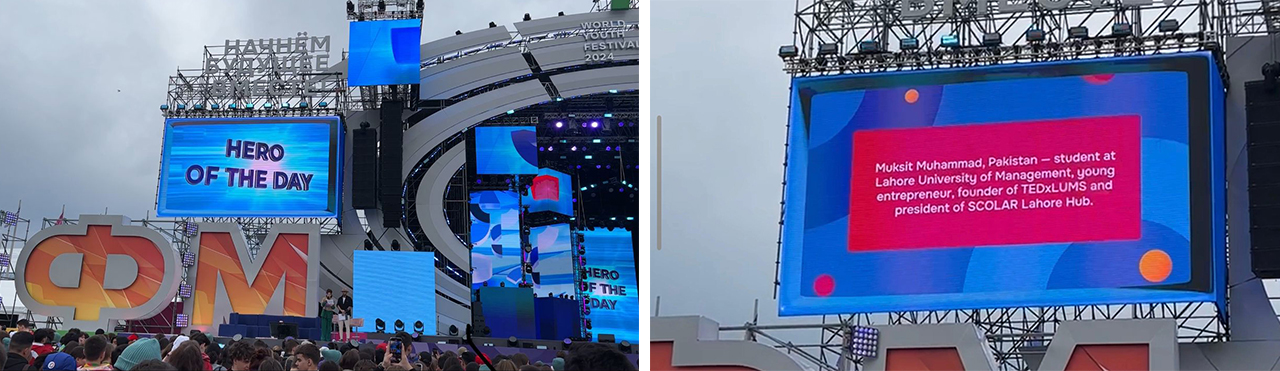 Two Economics students at LUMS, Syed Muhammad Sarim Gillani (BSc 2024) and Muhammad Muqsit Nadeem (BSc 2024) have emerged as the ‘Heroes’ of the World Youth Festival! They have secured both of the top honours at this prestigious event held from March 1-7 in Sochi, Russia. Recognised as the ‘Hero of the Festival’ and ‘Hero of the Day’ respectively, Sarim and Muqsit represented Pakistan in front of 20,000 participants from over 180 countries.